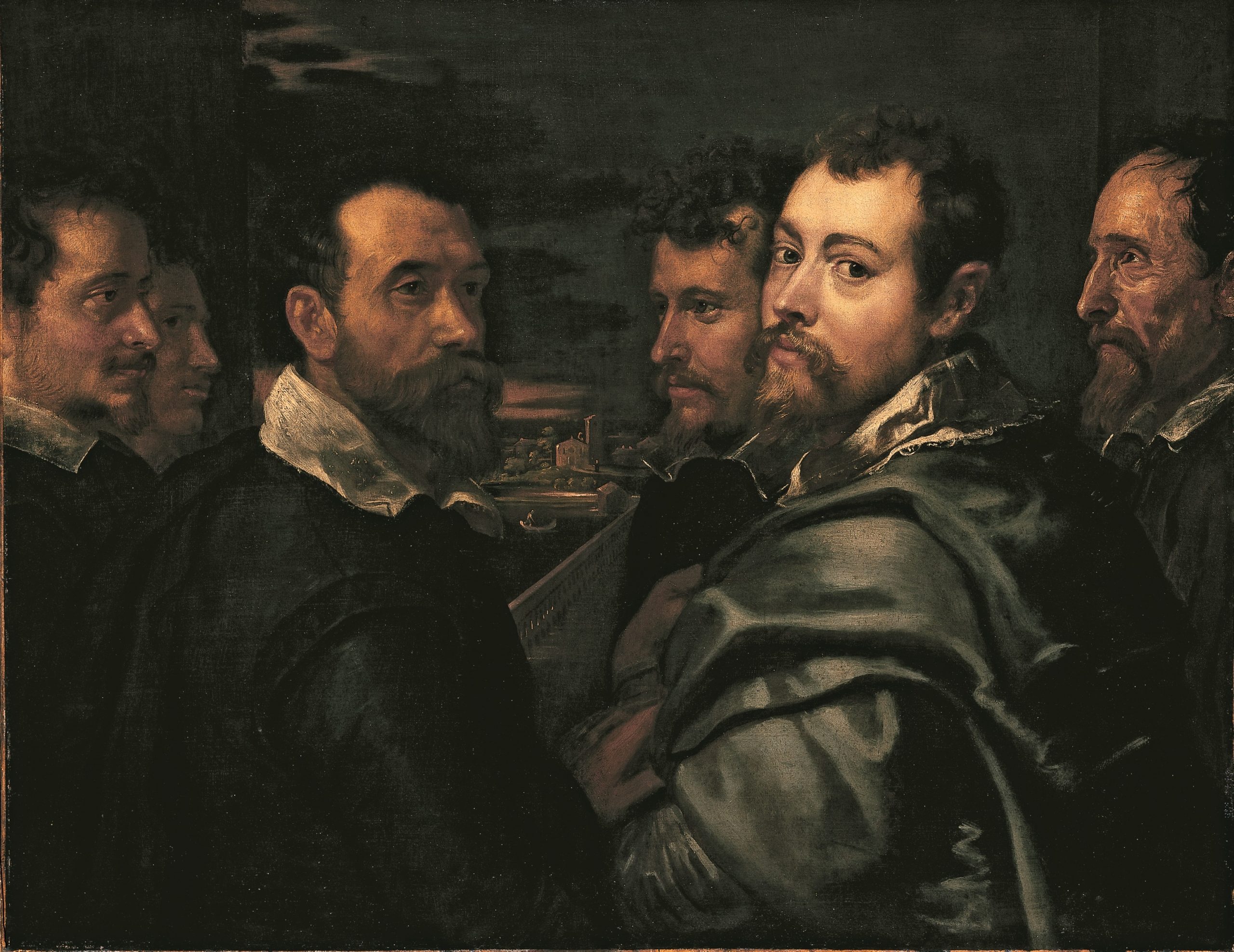 Rubens’ first known self-portrait. Glancing over his shoulder – capturing both a lively moment and the symbolism of artistic genius – the painter invites us into a noble circle of gentlemen. The Ponte di San Giorgio leading from the centre to the background shows that the location is the Palazzo Ducale in Mantua, northern Italy, where the 23 year-old painter had been called to the court of Duke Vincenzo Gonzaga. Sadly only two of the figures have so far been identified with certainty. On the left behind Rubens stands his brother Philip, to whom he was close. In profile on the right is their mutual teacher and mentor Justus Lipsius, a prominent philosopher from Leuven. Amidst the political and religious conflicts of the time, his neo-stoic attitude offered a non-demoninational moral and ethical code, to which Rubens also adhered throughout his life.
