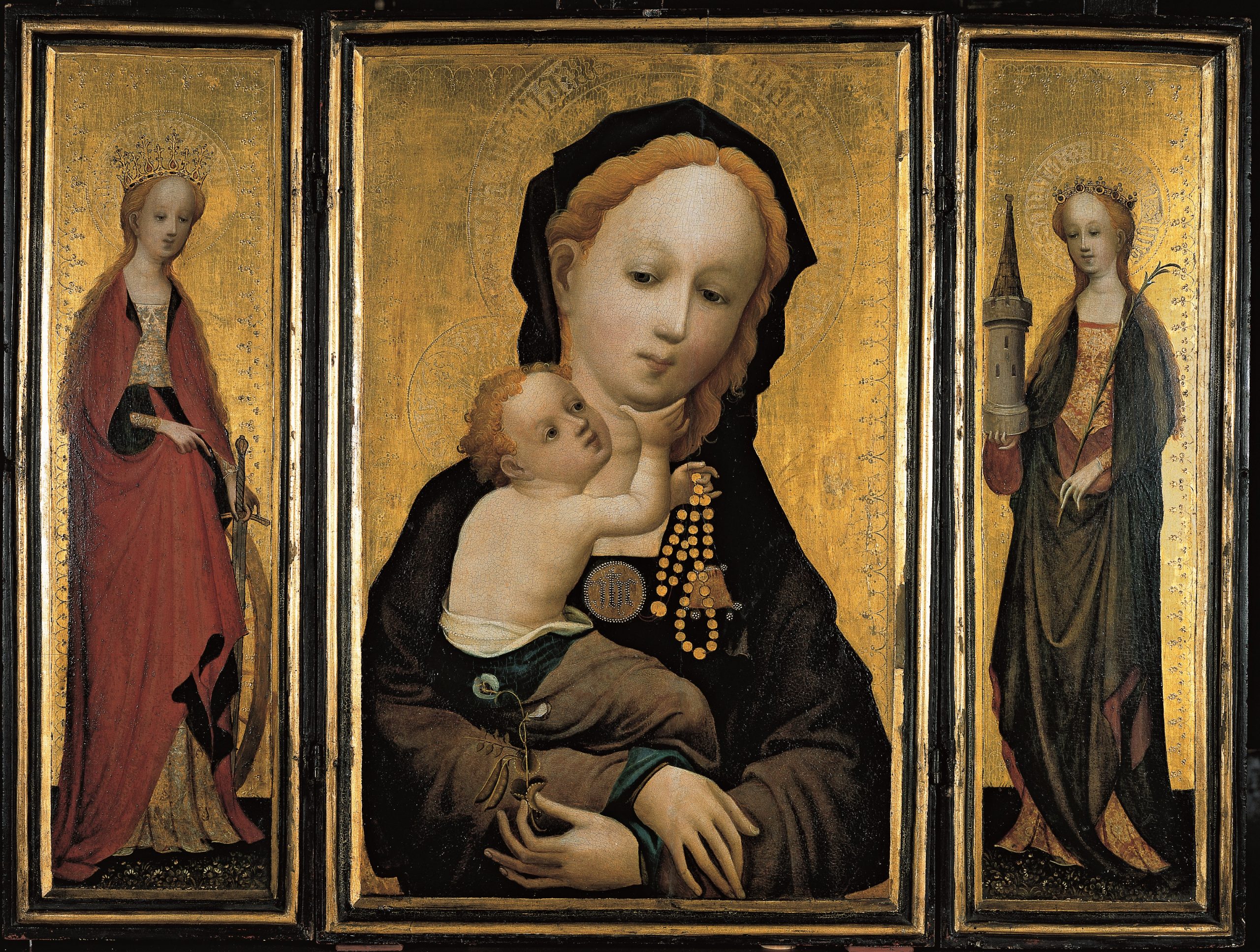 Das Format dieses Triptychons ist Programm. Da die Höhe genau der Breite eines Flügels plus der Mitteltafel entspricht, scheinen sich bei geöffneten Flügeln zwei Quadrate zu durchdringen. So wird auf versteckte Weise ein enger Zusammenhalt zwischen den ganzfigurigen weiblichen Heiligen auf den Flügelinnenseiten und der halbfigurigen Muttergottes in der Mitte hergestellt. Die Inschriften der Heiligenscheine unterstreichen diesen Zusammenhang: Wie die Gottesmutter werden auch Katharina (links) und Barbara (rechts) ausdrücklich als »virgo« (Jungfrau) bezeichnet. Einiges deutet darauf hin, dass das Werk aus der Kölner Kartause stammt. An seiner Herstellung scheinen zwei Maler beteiligt gewesen zu sein.