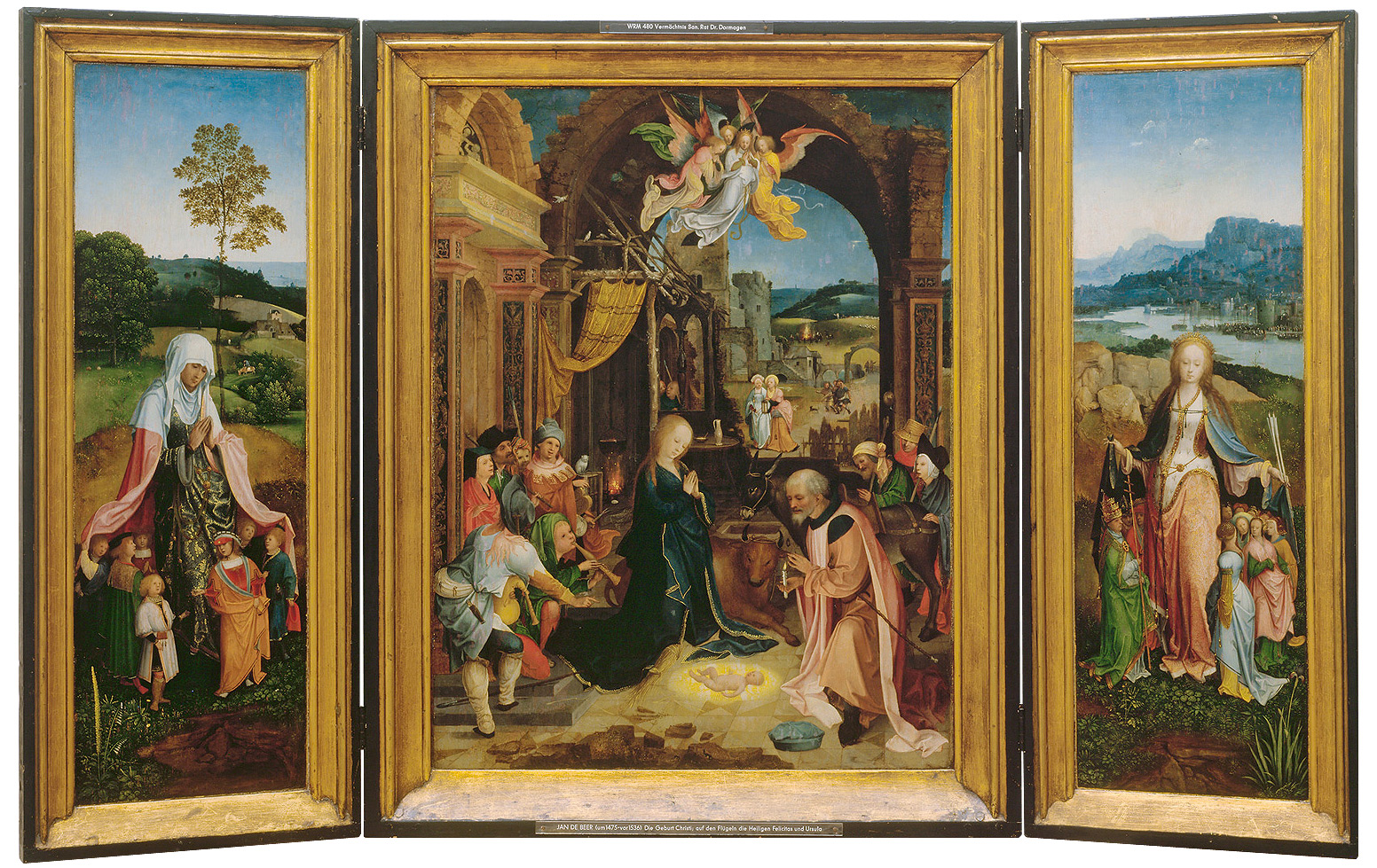 Jan de Beer zeigt dem Betrachter noch weitere Dinge, die in symbolischem Zusammenhang zur Geburt Jesu stehen: So spielt die dargestellte Ruine auf den Palast des Königs David an, von dem Christus abstammte. Die Getreidegarbe zwischen Maria und dem Kind verweist auf den Geburtsort Beth-Lechem (Haus des Brotes) und auf die Hostie der Hl. Messe. Das »Loch im Boden« am unteren Bildrand erinnert an eine Überlieferung, derzufolge Christus in einer Stall-Höhle geboren wurde. Im Hintergrund auf dem Weg sieht man zwei Frauen: Hebammen, nach denen Josef geschickt hatte. Sie kommen zu spät und können nur noch die Jungfräulichkeit Mariens bezeugen – eine Überprüfungsaufgabe, die bei mittelalterlichen Gerichtsprozessen in der Tat von Hebammen wahrgenommen wurde. Rund um die Heilige Familie haben sich Hirten versammelt. An ihrer einfachen Kleidung und den Musikinstrumenten erkannte der mittelalterliche Betrachter den niederen Stand dieser Personen. Diese Ankunft der Hirten beim Neugeborenen ist das eigentliche Thema des Mittelbildes.