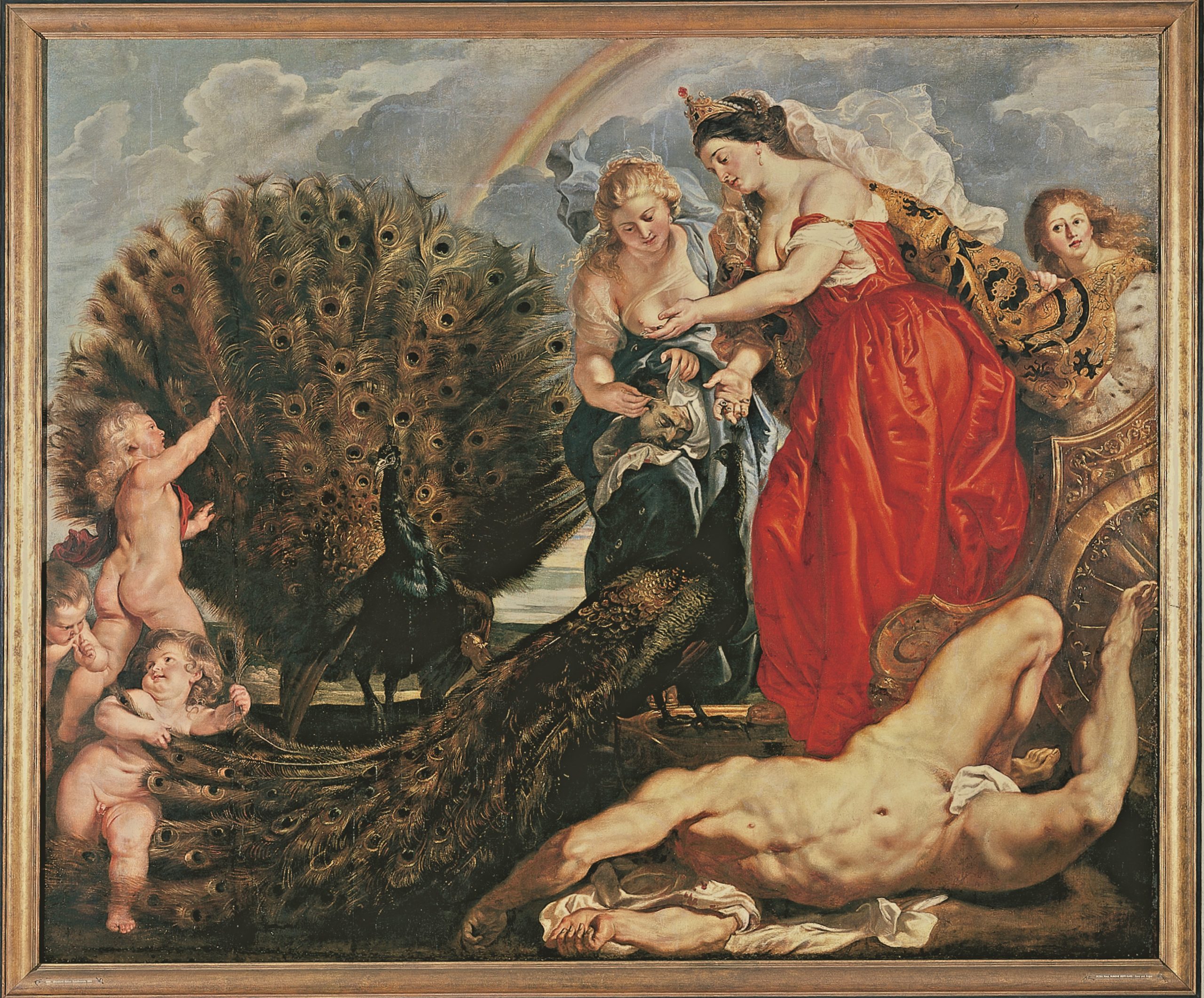 Im Vordergrund liegt der geköpfte Leib des hundertäugigen Argus. Mit seinen Augen schmückt Juno das Federkleid der Pfauen. Götterbotin Iris assistiert. Ihr Name verkörpert den Regenbogen, aber auch die Iris im menschlichen Auge. Der prächtige Akkord der Grundfarben Blau-Rot-Gelb erinnert an die damals aktuelle Farbenlehre. Ein Fest für das Auge bedeuten auch die virtuos gemalten rauschenden Stoffe, samtigen Federn und prallen Körper.
