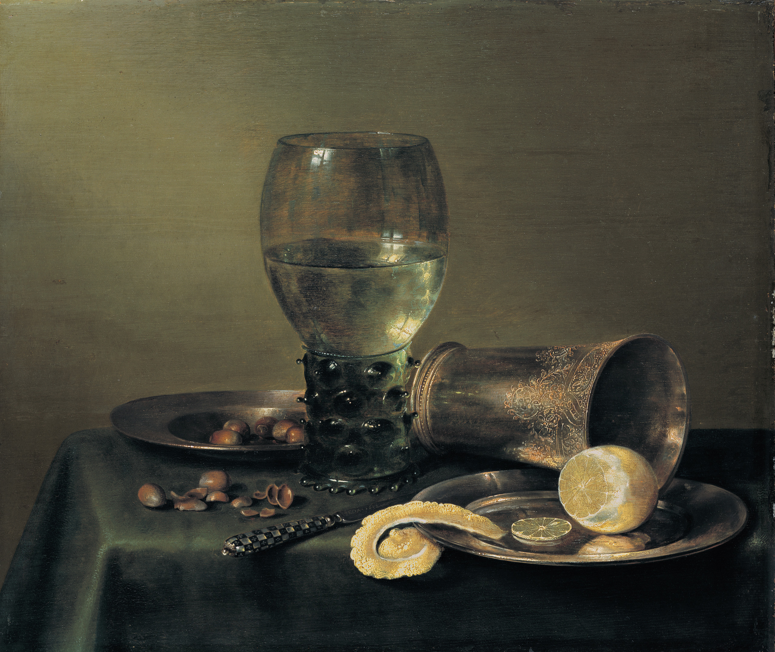 Heda war ein Meister toniger Farbigkeit, geometrischer Komposition und optischer Effekte. Der Tisch bildet eine waagerechte Bühne für den senkrecht aufragenden Römer. Messer, Becher und Schalen liegen in der Diagonale. Gleich fünfmal spiegelt sich ein Fenster im Glas. Auf Silber und Zinn schimmern farbige Reflexionen. Der gekippte Becher, die geknackten Nüsse und die vom Herabfallen bedrohte Zitronenschale bringen Bewegung in das »stille Leben«. Mit der Frucht säuerte man den Wein. Der Becher diente als Abendmahlsgefäß. Die Nuss war ein Christussymbol. Gemeinsam erinnern sie an die christliche Erlösung.