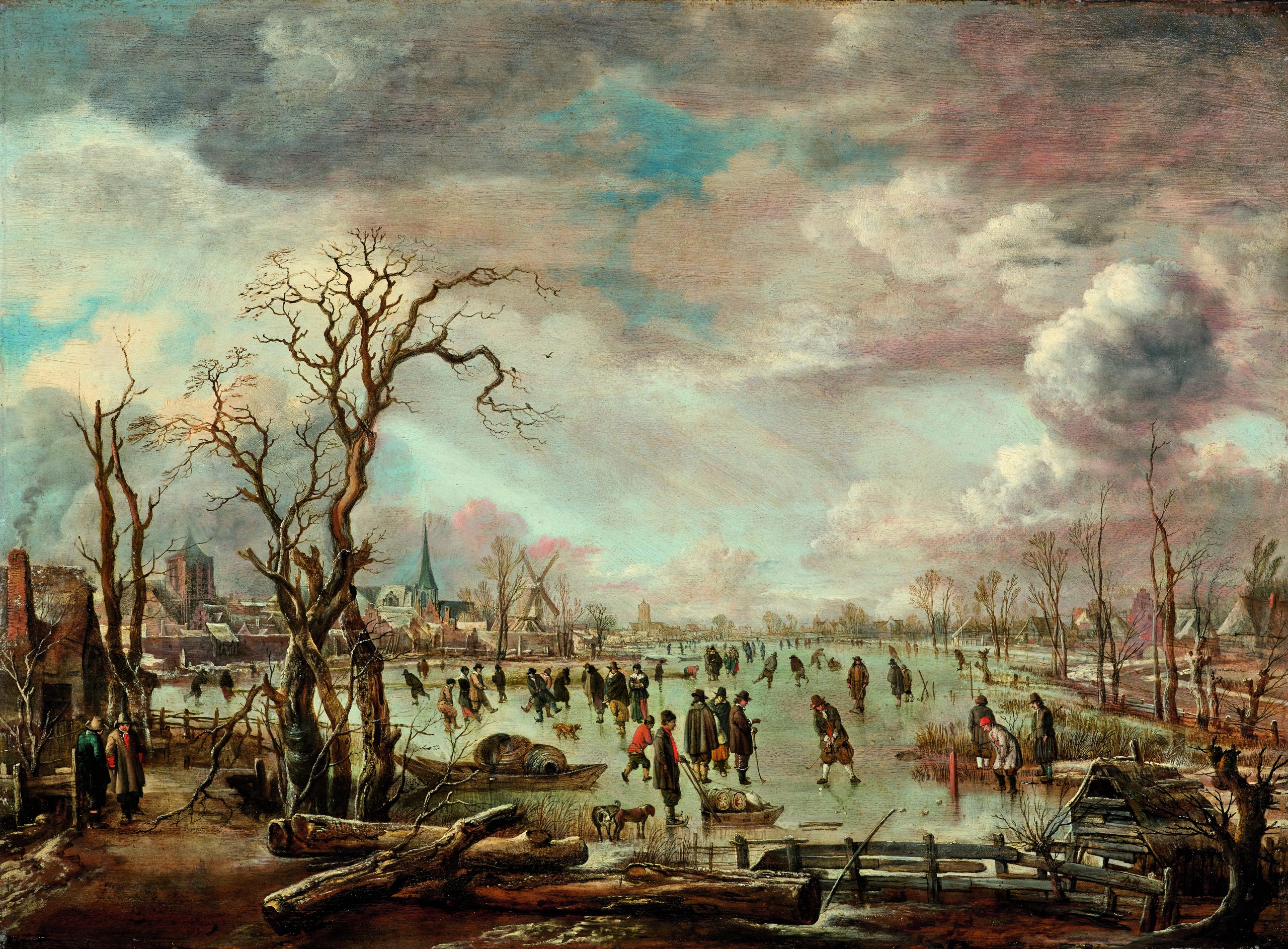 Van der Neer specialised in the particular lighting mood of moonlit and wintry landscapes. The milky sunlight evoked by the cool pastel tones of this painting captures the atmosphere of a frosty winter’s day masterfully. Bare trees, snow-covered tree trunks and the waterfront of a small town provide a decorative frame for our view of the frozen canal and the lively activities on the ice. The large format and fine workmanship make the panel a highpoint of van der Neer’s art. Unsurprisingly, it belonged at one time to the excellent collection of the Amsterdam silk merchant Antony Sijdervelt (†1765).