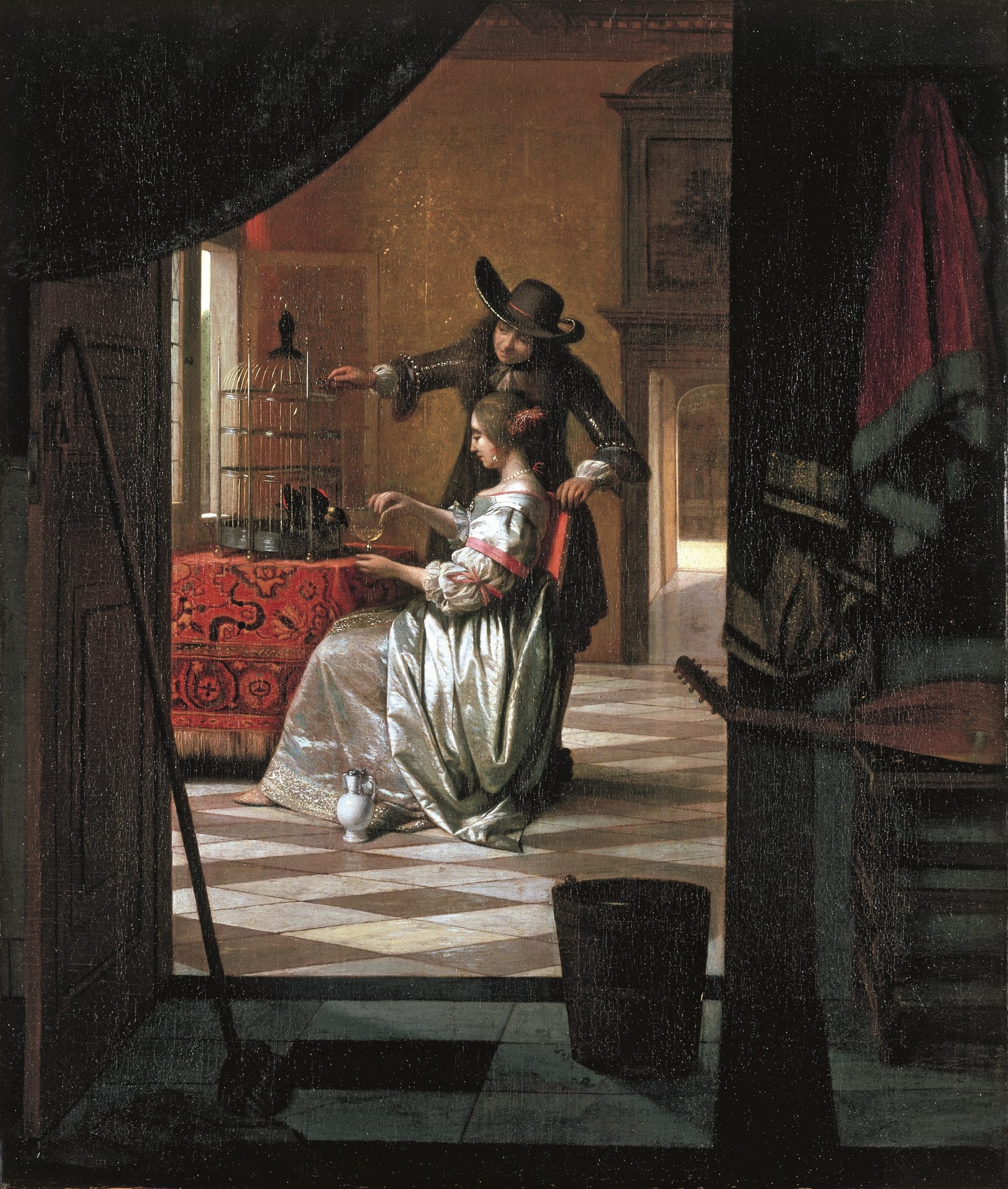 The painter skilfully places us as secret observers in the dark anteroom. He creates the perspectival illusion masterfully: we watch the rendezvous in the light-flooded reception room as if through a keyhole. A maid has left a bucket and broom behind on the threshold – an allusion to moral purity. Will she return and catch us spying on the couple?