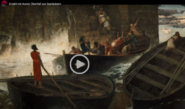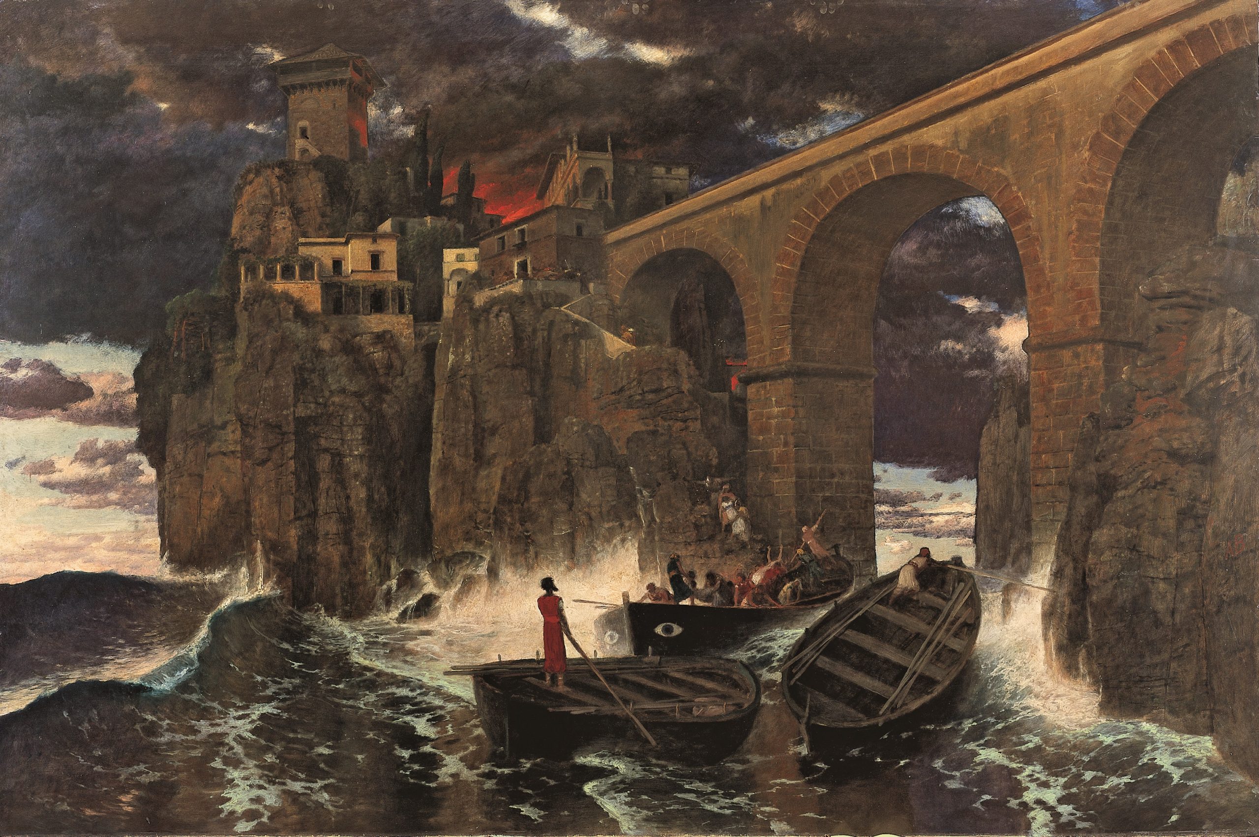 Ever since the 17th century, the representation of wild, heaving seas has been a frequent simile in European painting for life's shifts and turns and confusions. Böcklin's phantasmagoric staging is a fine example of the kind of correspondence that artists have tried to find between man and nature. The portrayal of a town being pillaged abovve a seething sea aims at an even deeper message: it is humanity that succumbs to itself and to its own power.