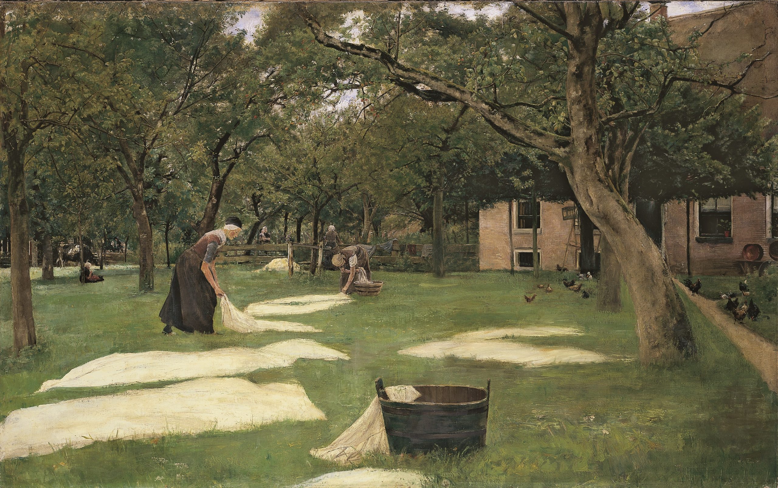 Although Max Liebermann knew the French Impressionists, he was initially loath to go so far and break up the colour surfaces and create them by applying loose strokes side by side. For him, nature remained grey. He believed that the correct way to render atmospheres was by shadding, not colour contrasts. “The Bleaching Ground“ is one of his masterpieces. He painted this ambitious work at Zweeloo in the Netherlands. Coming from Berlin, he found there the peace he desired and a world still under the sway of farming.